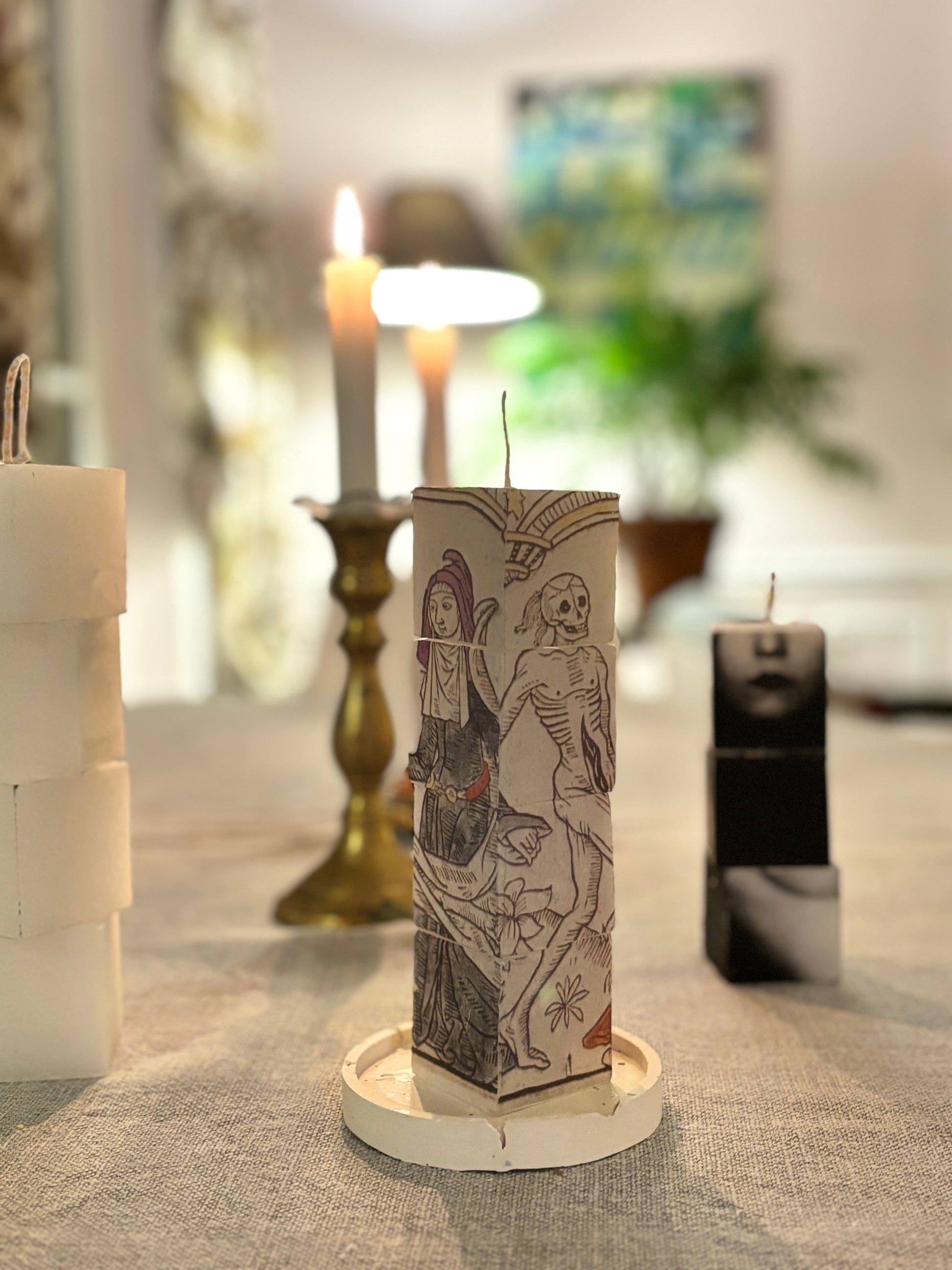 Danse Macabre Candle draws from medieval memento mori iconography, reimagined in a sculptural puzzle form. It is hand-assembled from individual paraffin cubes that feature public domain illustrations sourced from authentic medieval Dance of Death paintings or Public Domain photography. This candle merges art history with functional design—each segment burns independently, allowing you to experience the piece as both installation and light source. The geometric composition references the haunting symmetry of 15th-century Dance of Death paintings, transforming a darkly philosophical theme into contemporary home décor.